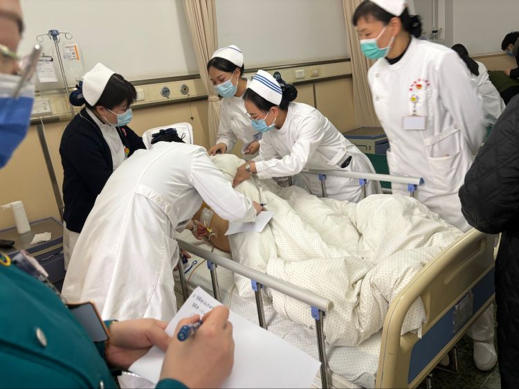 了解患者基本情況后,王爽一行來到病房,責(zé)任護(hù)士對(duì)患者進(jìn)行了詳細(xì)的體格檢查。大家對(duì)患者進(jìn)行溫情溝通,評(píng)估患者的飲食、疼痛度,查看患者情況及各項(xiàng)護(hù)理措施落實(shí)情況,對(duì)存在的疑難問題進(jìn)行了現(xiàn)場(chǎng)指導(dǎo)。