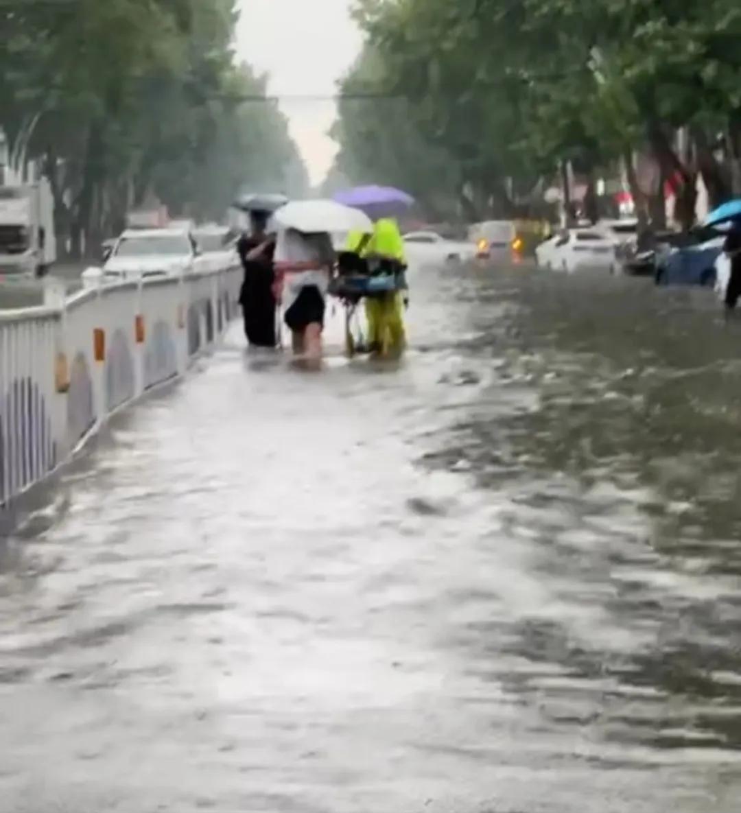 圖為急診科醫(yī)務人員在積水路段接診患者