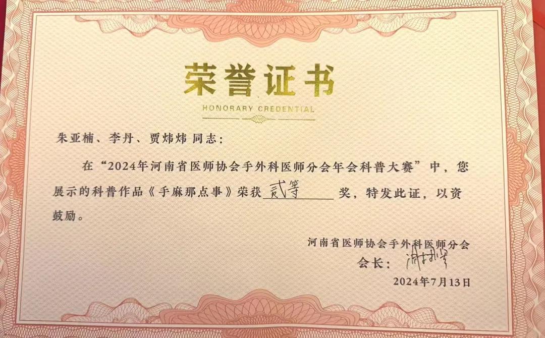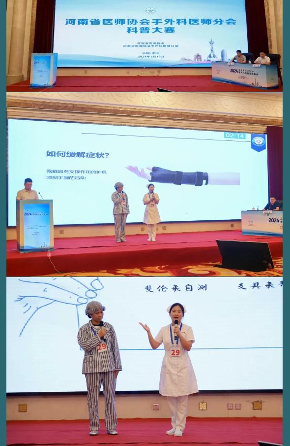 下午,在“2024年河南省醫(yī)師協(xié)會(huì)手外科醫(yī)師分會(huì)年會(huì)科普大賽”上,來自全省各地的精英選手們以生動(dòng)多樣的形式,將復(fù)雜的醫(yī)學(xué)知識(shí)轉(zhuǎn)化為易于理解、貼近生活的科普內(nèi)容,展現(xiàn)了手外科醫(yī)學(xué)的魅力與溫度。經(jīng)過激烈角逐,漯河市骨科醫(yī)院(漯河醫(yī)專二附院、漯河市立醫(yī)院)副主任醫(yī)師代彭威、護(hù)師李丹、護(hù)士賈煒煒榮獲二等獎(jiǎng)。他們?cè)诠ぷ髦?,以《腕管綜合征》為題積極準(zhǔn)備,認(rèn)真撰寫演講材料、精心制作演講幻燈片、反復(fù)推敲演練,對(duì)腕管的高發(fā)人群以及怎么預(yù)防怎么鍛煉,進(jìn)行了生動(dòng)形象的專題講解。在高手云集的大賽中榮獲優(yōu)異成績(jī),充分展示了漯河市骨科醫(yī)院手外科團(tuán)隊(duì)在學(xué)術(shù)研究與科普傳播方面的雙重實(shí)力。