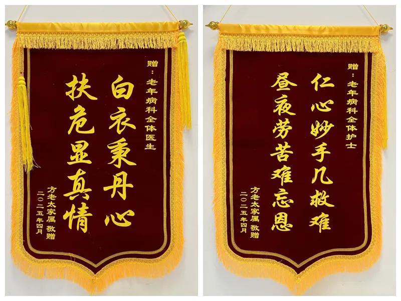 近日,兩面紅底金字的錦旗被鄭重送至市二院老年醫(yī)學(xué)科。家屬哽咽著展開(kāi)錦旗:“白心秉丹心,扶危顯真情”致全體醫(yī)生,“仁心妙手幾救難,晝夜勞苦難忘恩”贈(zèng)與醫(yī)護(hù)團(tuán)隊(duì)。這不僅是患者家屬的深情告白,是百歲老人方奶奶與老年醫(yī)學(xué)科醫(yī)護(hù)團(tuán)隊(duì)五年多、1800多個(gè)日夜的生死相托,更是一個(gè)家庭對(duì)“醫(yī)者仁心”最深情的詮釋。
