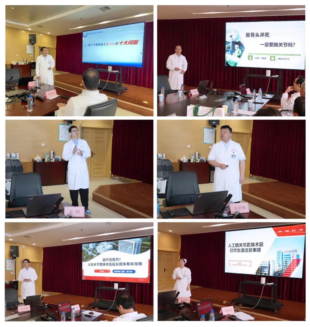 隨后,精彩紛呈的科普講座環(huán)節(jié)正式開啟。張紹安主任率先圍繞 “人工髖關(guān)節(jié)置換患者最關(guān)心十大問題” ,從手術(shù)原理到術(shù)后康復(fù),深入淺出地解答了病友們心中的疑惑。李智浩主任則聚焦 “保頭或換髖如何選擇” 以及 “人工髖關(guān)節(jié)置換術(shù)后肌力訓(xùn)練” 這兩個關(guān)鍵話題,進(jìn)行了細(xì)致入微的分析。幫助病友們了解不同治療方案的優(yōu)劣,掌握科學(xué)的康復(fù)訓(xùn)練方法。吳大龍醫(yī)生帶來的 “避開這些坑!全髖關(guān)節(jié)置換術(shù)后延長假體壽命攻略”,可謂是滿滿的干貨。他用通俗易懂的語言為病友們傳授實用的經(jīng)驗,讓大家明白如何在日常生活中更好地保護(hù)假體。孟軻醫(yī)生講解 “髖關(guān)節(jié)置換術(shù)后預(yù)防假體脫位常識”,從細(xì)節(jié)入手,強(qiáng)調(diào)預(yù)防的重要性。張世魁醫(yī)生的 “如何有效‘補(bǔ)鈣’”,讓病友們了解到補(bǔ)鈣對于骨骼健康的關(guān)鍵作用以及正確的補(bǔ)鈣方法。王瑩輝護(hù)士長分享 “髖關(guān)節(jié)置換術(shù)后日常生活注意事項”,涵蓋了衣食住行各個方面,為病友們的術(shù)后生活提供了貼心指導(dǎo)。
