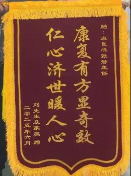 與此同時,科室還收到一面印有“康復有方顯奇效,仁心濟世暖人心”字樣的錦旗。在患病期間,患者飽受腰痛、下肢麻木等癥狀折磨,嚴重影響日常生活。來到康復科后,科室負責人張靜帶領科室團隊根據(jù)其病情制定個性化針灸治療方案,通過精準取穴、規(guī)范施針,配合專業(yè)康復指導,逐步減輕患者病痛,助其恢復正常生活。患者為表感激,特贈錦旗,錦旗上的話語是對科室治療效果的高度認可。