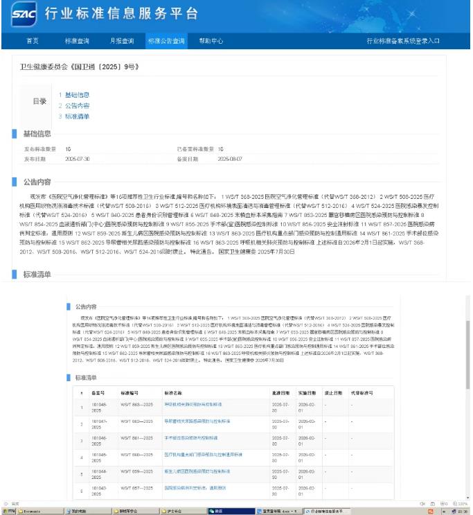 國家衛(wèi)生健康委員會近日正式發(fā)布《國衛(wèi)通〔2025〕9號》公告,公布并備案了16項推薦性衛(wèi)生行業(yè)標準,其中14項重點圍繞醫(yī)院感染控制領(lǐng)域。該批標準將于2026年2月1日起全面實施,同時,4項修訂前的舊版標準同步廢止。新標準的發(fā)布實施,對進一步規(guī)范醫(yī)院感染管理流程、提升醫(yī)療質(zhì)量安全水平具有重要意義。