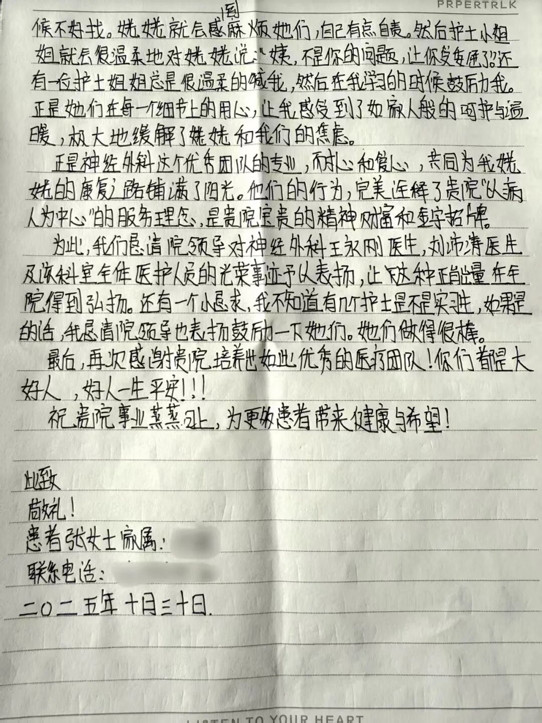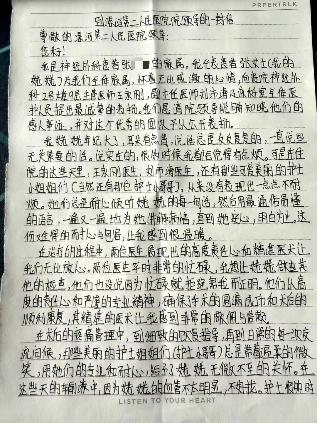 據(jù)了解,張女士的姥姥因“背部腫物”一直備受困擾,6年前在其他醫(yī)院手術(shù)治療后效果不佳,1年內(nèi)復(fù)發(fā),腫物逐漸增大,并出現(xiàn)肩部活動(dòng)受限伴肩部疼痛。來(lái)到市二院后神經(jīng)外科醫(yī)生立即進(jìn)行手術(shù),因術(shù)中腫物與周圍組織粘連嚴(yán)重,手術(shù)歷時(shí)近2個(gè)小時(shí),術(shù)后恢復(fù)良好。“我的姥姥年紀(jì)大了,耳朵有點(diǎn)背,說(shuō)話總是反反復(fù)復(fù),啰啰嗦嗦的。說(shuō)實(shí)在的,有時(shí)候我都會(huì)覺(jué)得有點(diǎn)煩。可是從住院以來(lái),劉沛濤主任、王永剛醫(yī)生,還有那些美麗可愛(ài)的護(hù)士小姐姐們和帥氣的護(hù)士小哥哥,從來(lái)沒(méi)有表現(xiàn)出一點(diǎn)點(diǎn)不耐煩。他們總是耐心地聽(tīng)姥姥講,一遍遍地解釋給她聽(tīng),直到她聽(tīng)懂為止。”張女士的表?yè)P(yáng)信中字里行間包含著對(duì)神經(jīng)外科整個(gè)醫(yī)護(hù)團(tuán)隊(duì)暖心服務(wù)的認(rèn)可與贊美。
