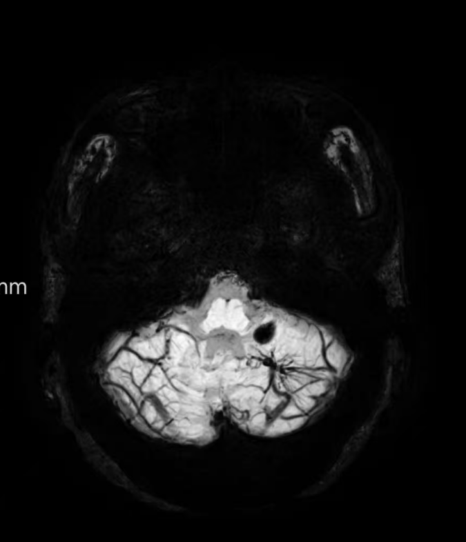 我們大腦里密密麻麻的靜脈血管,在常規(guī)影像上是“灰蒙蒙”的一片。但SWI對(duì)脫氧血液極其敏感,能將靜脈血管清晰地顯示為黑色的細(xì)線。這個(gè)本領(lǐng)非常有用: