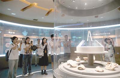 采訪團(tuán)成員在賈湖遺址博物館參觀。記者 李宜書 攝