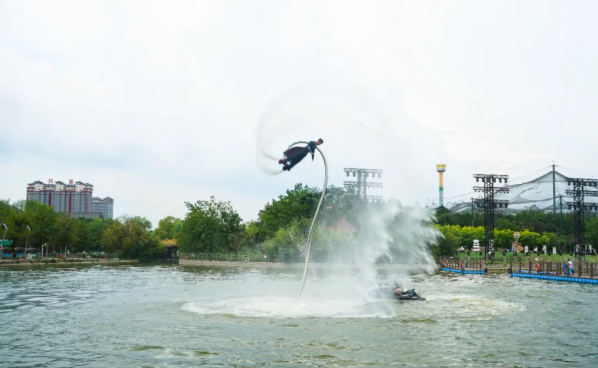水上表演更是精彩絕倫?!丢?dú)竹水上漂》節(jié)目中,表演者們腳踩楠竹,在水面上輕盈滑行,仿佛在水上飛舞,引得觀眾們驚嘆不已?!端巷w人》的表演者們借助噴水裝置在空中翻轉(zhuǎn)騰挪,如同超人般翱翔于水面之上;而《水上火壺》則將傳統(tǒng)藝術(shù)與現(xiàn)代科技完美結(jié)合,火光與水花交相輝映,震撼的視覺效果讓觀眾們?nèi)滩蛔“l(fā)出陣陣喝彩和尖叫。鳳棲湖劇場(chǎng)內(nèi),大型舞臺(tái)劇《時(shí)空奇緣》的現(xiàn)場(chǎng)排練預(yù)演同樣精彩,演員們精湛的表演和動(dòng)人的故事引得觀眾掌聲雷動(dòng),沉浸其中。