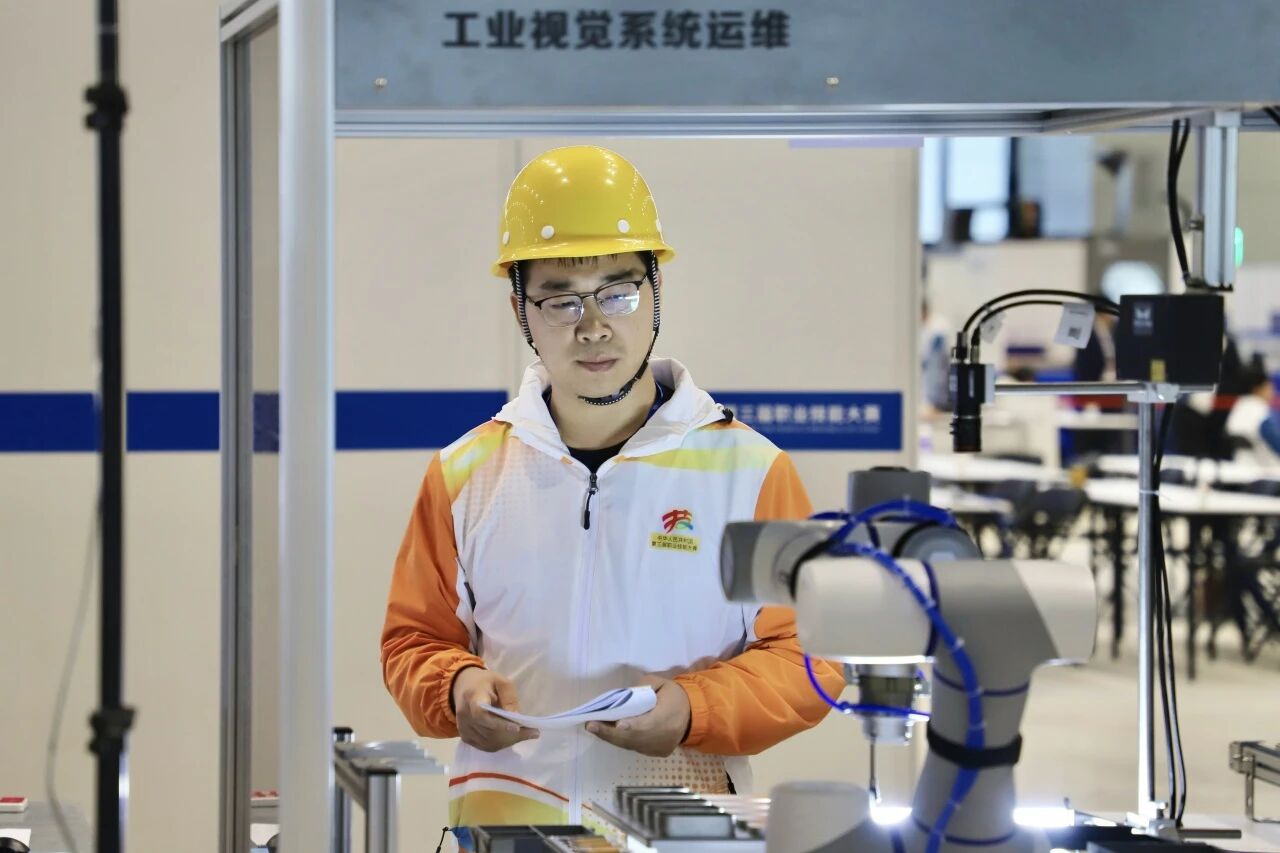 中華人民共和國第三屆職業(yè)技能大賽閉幕式上,自主移動機器人(世賽選拔項目)金牌獲得者楊奇瑞、介明鑫,工業(yè)視覺系統(tǒng)運維(國賽精選項目)金牌獲得者王華磊,機器人系統(tǒng)集成(世賽選拔項目)銀牌獲得者彎有道、王永康上臺領(lǐng)獎。