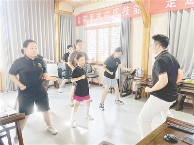 目前正值暑假,知育學堂內的青少年中醫(yī)夏令營活動正在進行中。記者在夏令營的活動教室看到,十幾個孩子跟著老師練習八段錦。參加夏令營的孩子們來自天津、河北、鄭州等。“我媽媽從河北開車把我送到這里,主要是為了培養(yǎng)我對中醫(yī)的興趣,讓我了解如何調理自己的身體。”今年12歲的陳榮告訴記者。