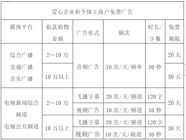 1、服務(wù)對(duì)象:在疫情防控期間,凡向我市防疫一線捐款捐物的企業(yè)、個(gè)體工商戶(hù)(包括本地和外地企業(yè)),均可享受免費(fèi)廣告服務(wù)。