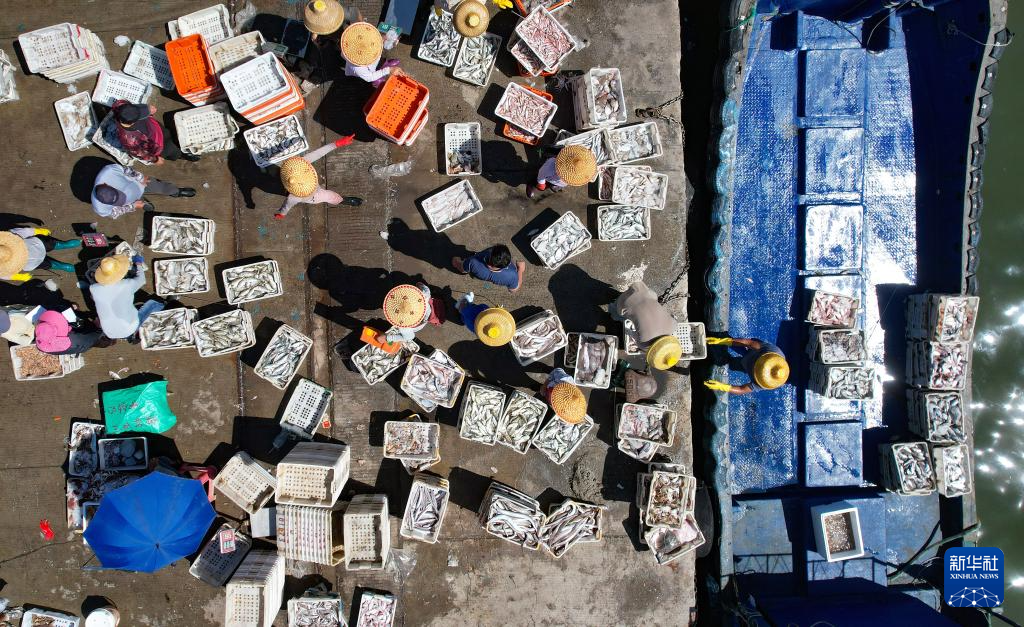 在海南省文昌市清瀾漁港碼頭,漁民和商販在卸貨、交易(8月21日攝,無人機照片)。
