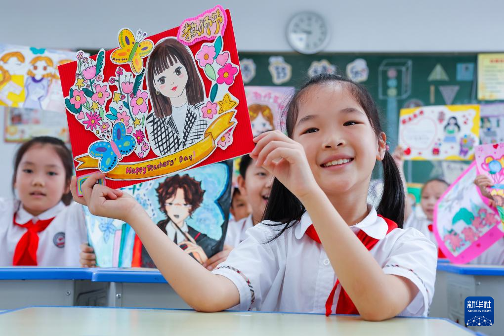 9月9日,在武漢市未來(lái)實(shí)驗(yàn)小學(xué)美林校區(qū),學(xué)生為教師送上節(jié)日祝福。