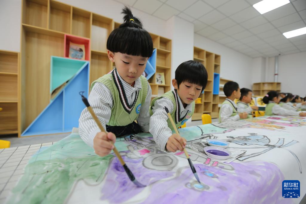9月28日,甘肅省定西市安定區(qū)幼兒園的小朋友在繪制《我愛你中國(guó)》長(zhǎng)卷。